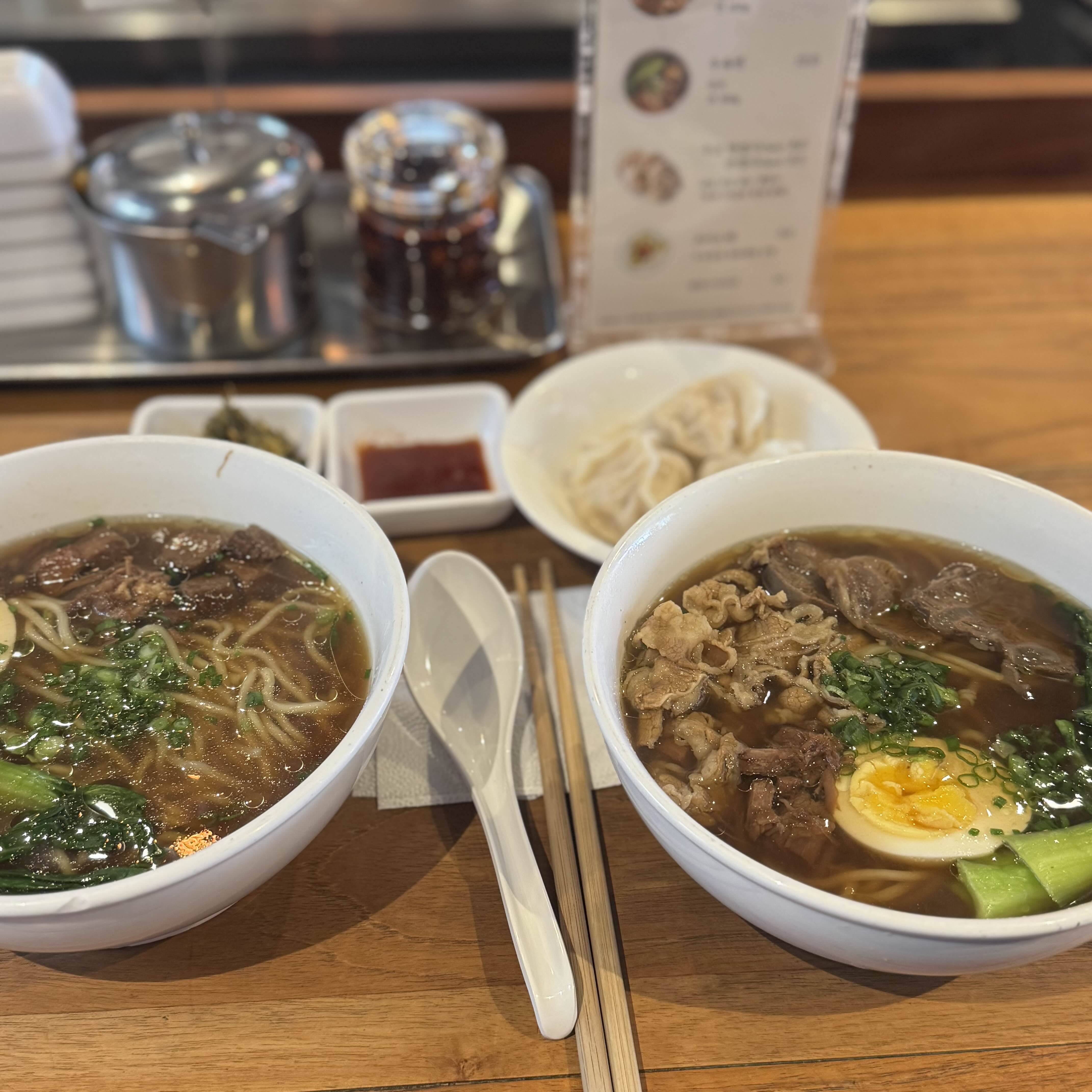 메뉴는 다양하지만, 가장 인기 있는 메뉴는 우육면이에요. '우육면 진'과 '우육면'이 대표적인데, 각각 양고기와 소고기를 사용해요. 가격도 합리적이라 점심시간에 직장인들이 많이 찾는 곳이에요. 그 외에도 만두와 사이드 메뉴도 준비되어 있어요.